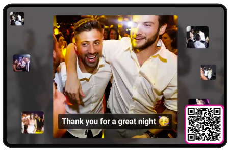 Sammle alle Fotos und Videos Deiner Gäste in einem digitalen Album, das Du sofort in einer Live-Diashow präsentieren kannst – ganz ohne Apps und ohne Aufwand.